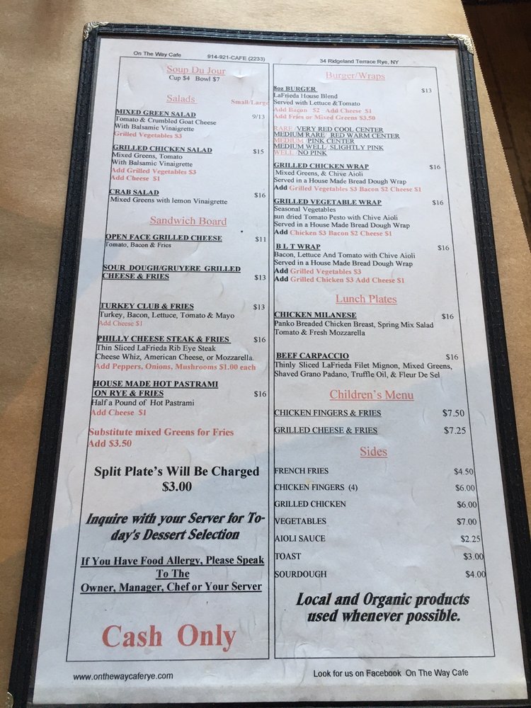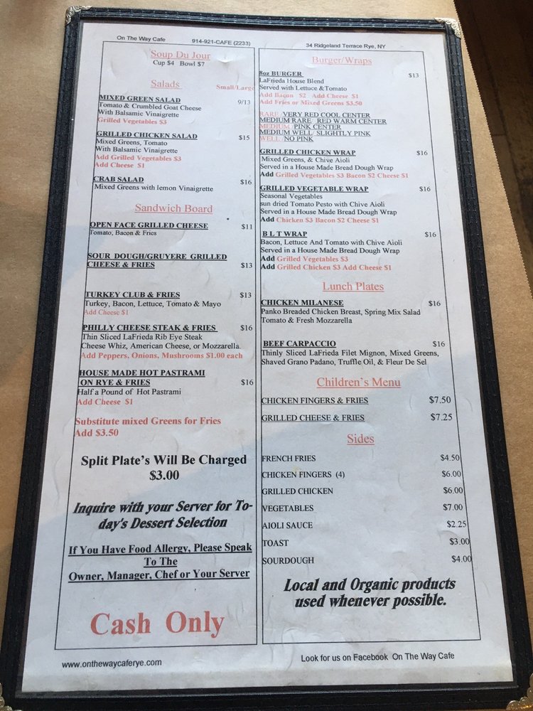 Introducing the menu at On The Way Cafe, a women-owned establishment in Rye, NY, offering a variety of delicious options in the categories of burgers, breakfast, and brunch. This cafe provides a unique dining experience with features such as outdoor seating, wheelchair accessibility, and gender-neutral restrooms. The menu includes mouth-watering items like Apple Cinnamon Steel Cut Oatmeal, Banana Walnut Pancakes, and Brioche French Toast. For beverages, there are options like Cappuccino, Grapefruit Juice, and Fresh Brewed Iced Tea. The commitment to sustainability is evident through the use of compostable containers and plastic-free packaging. With a focus on quality, comfort, and inclusivity, On The Way Cafe is a must-visit spot for a satisfying meal.